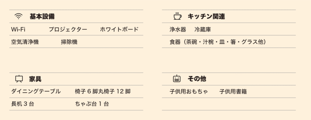 温かみのあるウッド調の空間で、講座や教室、カウンセリング、マルシェなど、様々な用途にご利用いただけます。アットホームな雰囲気は、お客様に安心感を与え、コミュニケーションをより円滑にします。